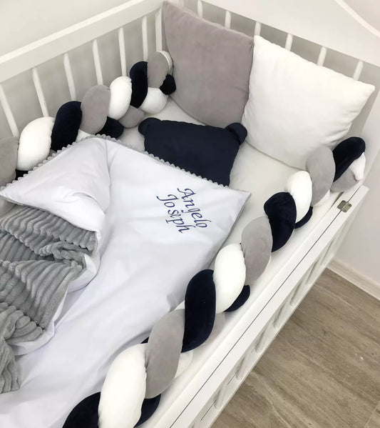 White & Gray Braided Crib Bedding Set – “White Cloud” ☁️