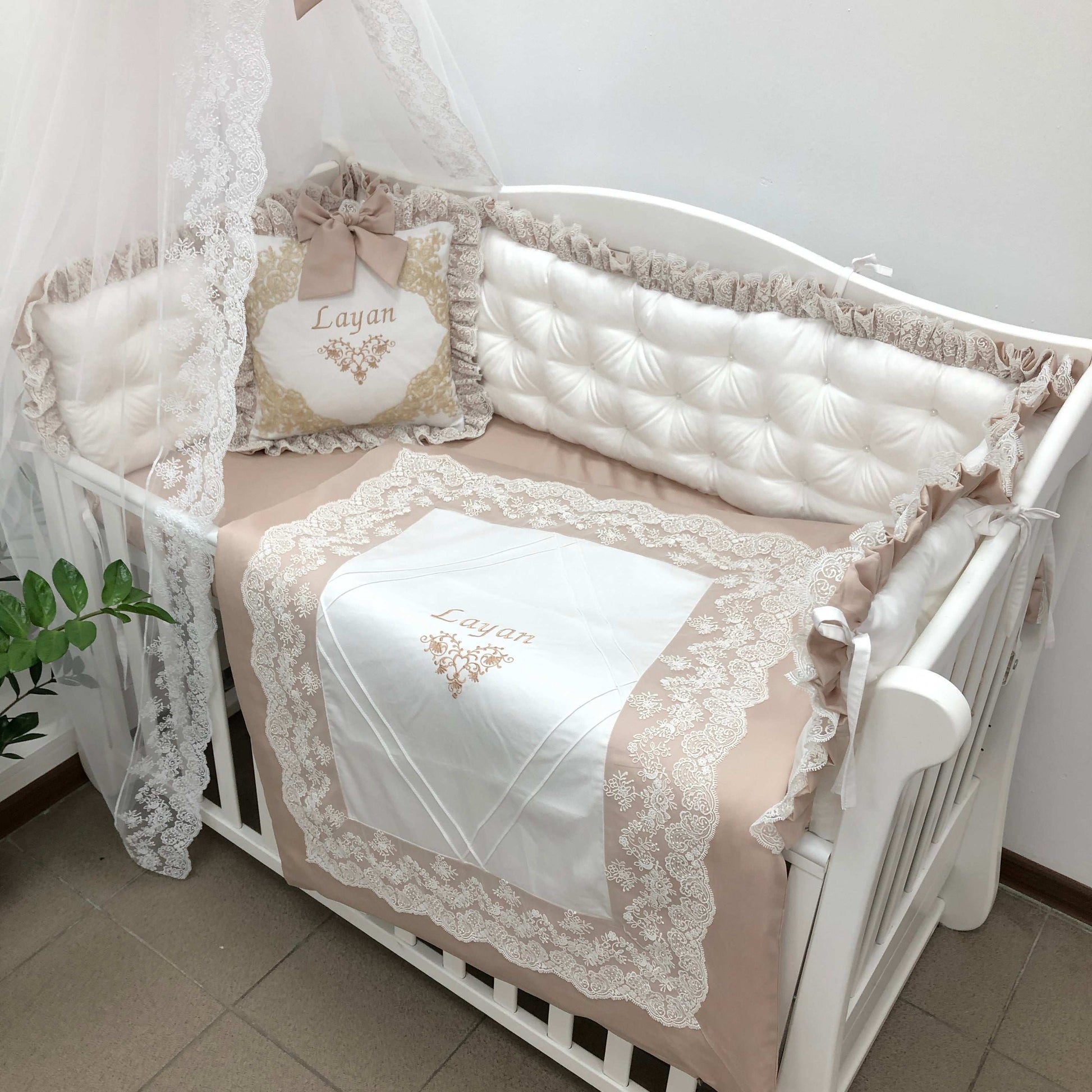 Create a royal and luxurious atmosphere in your baby's nursery with our personalized crib bedding set in timeless white and soft beige tones. This exquisite bedding set combines comfort, style, and safety, making it the perfect choice for your little one's crib.