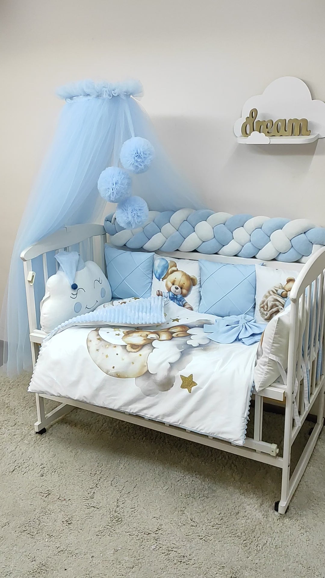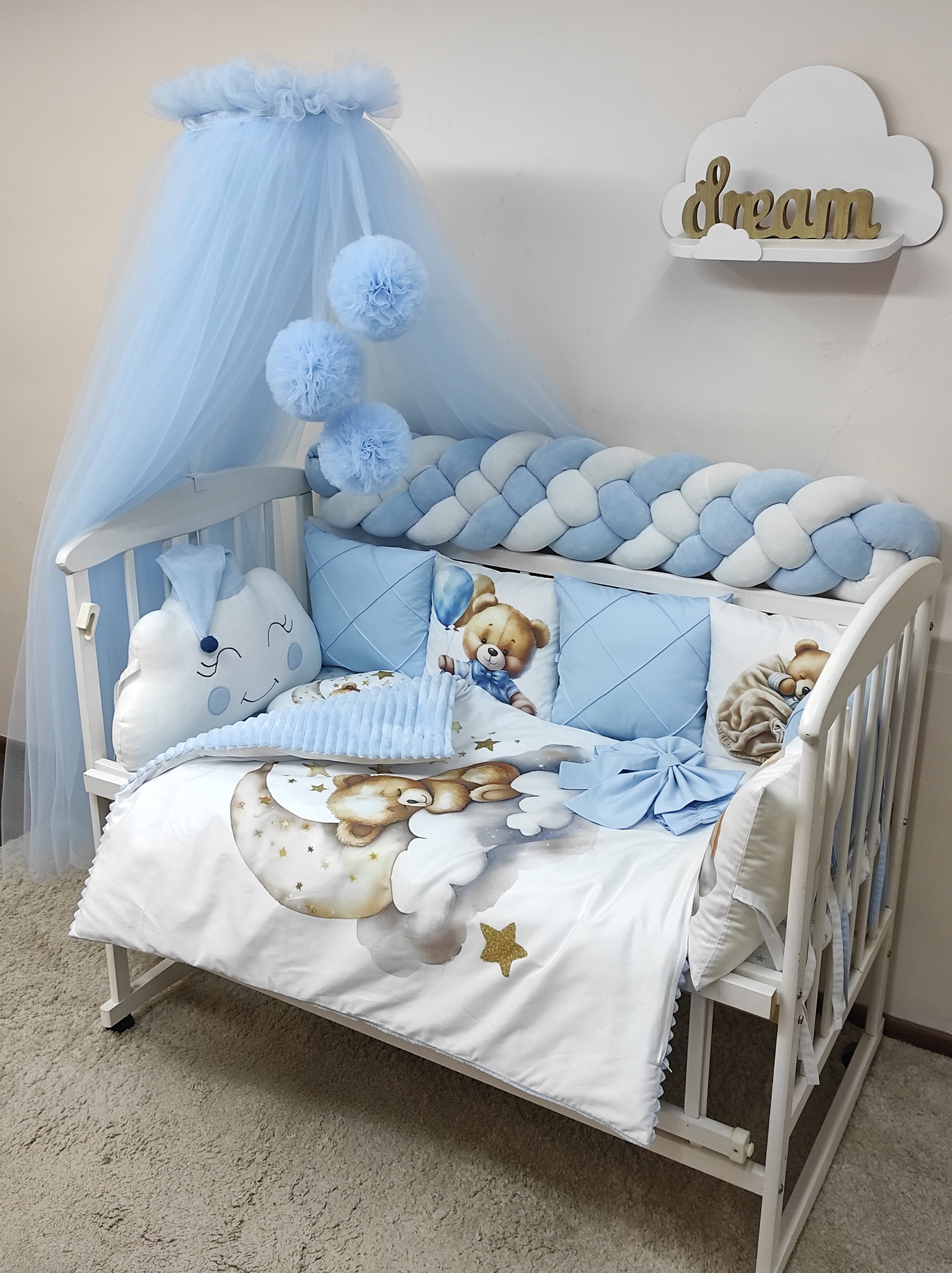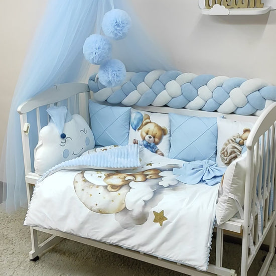 6-Piece Modular "Bear" Cushions: Interconnected cotton pillows (3 sky blue, 3 white with bear illustrations) for additional crib sides.